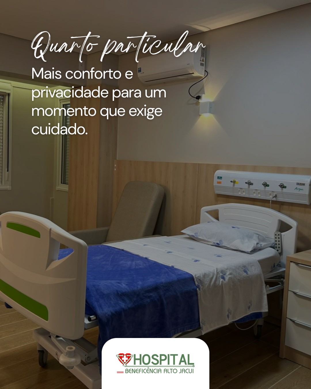 O quarto particular do Hospital Beneficência Alto Jacuí foi planejado para oferecer mais conforto, privacidade e tranquilidade durante o período de internação.